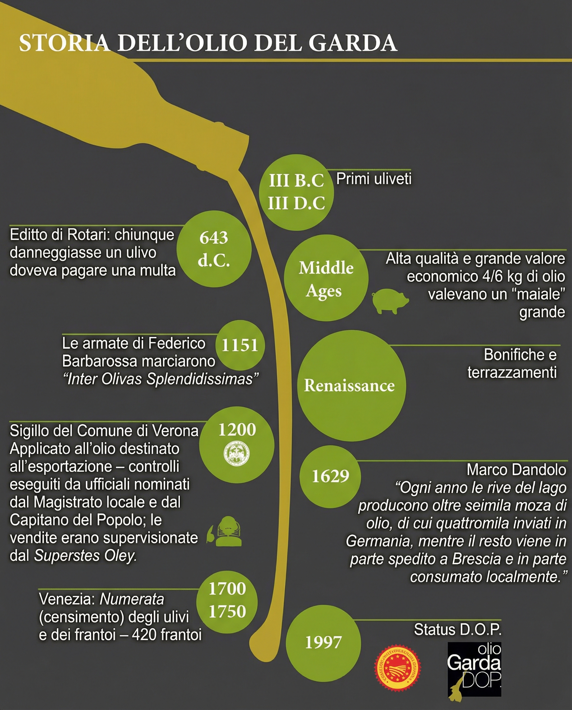 1200 – Istituzione dei bollini “Sigillum Comunis Veronae” che accompagnavano l’olio nelle esportazioni. La vendita era controllata da un funzionario appositamente designato, il “Superstes Oley”